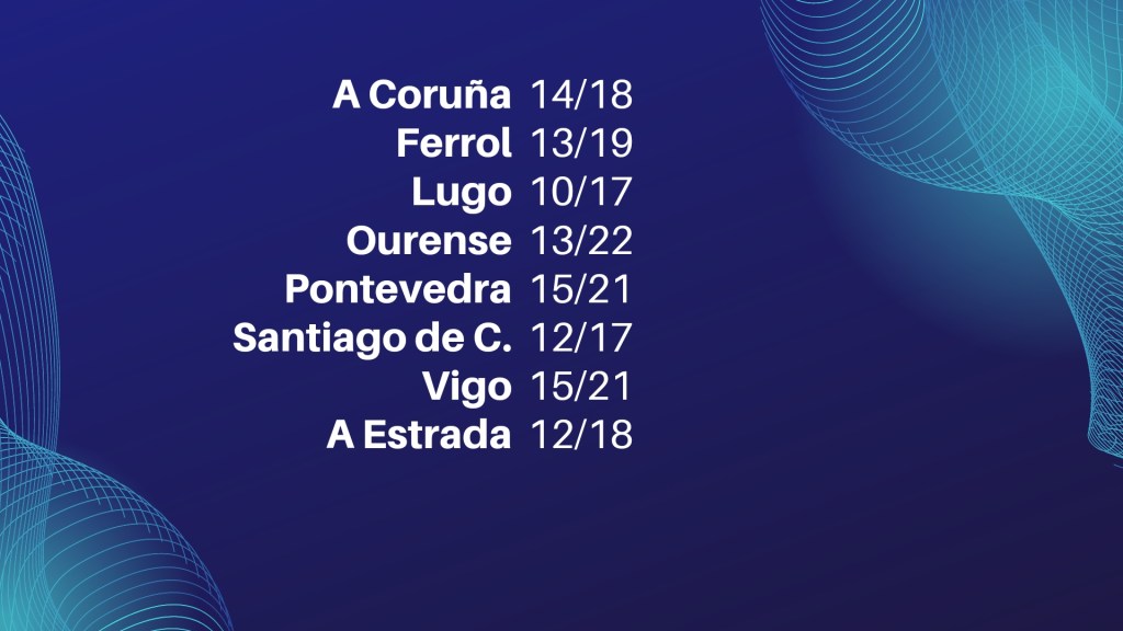 Durante o xoves teremos a chegada dunha nova fronte desde o norte, que deixará ceos nubrados e chuvascos xeneralizados, máis frecuentes e intensos pola mañá. As temperaturas sufrirán un lixeiro descenso. Os ventos soprarán do noroeste, frouxos no interior, moderados na costa.