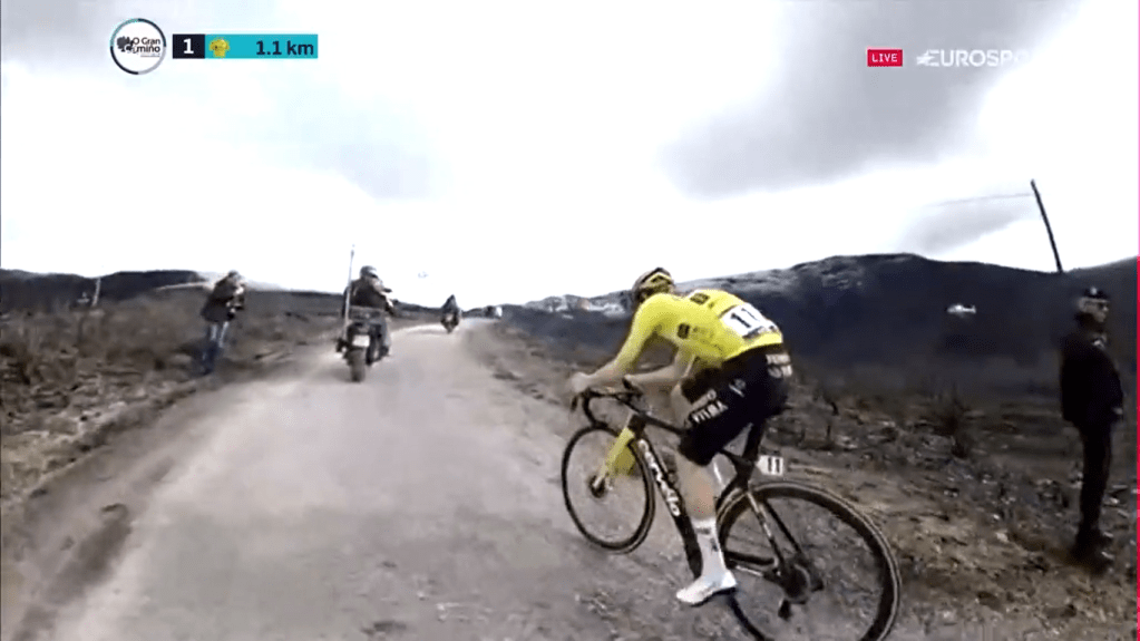 Os ciclistas rodaban por Rubiá con moito ritmo para coller o cruce para subir o Alto do Castelo, un cruce no que a colocación era vital debido a que se pasaba dunha estrada provincial a un camiño rural. O pelotón comezou a estirarse e quedaron só en cabeza Jonas Vigegaard e Atila Valter (Jumbo Visma), Ruben Guerreiro (Movistar) e Ion Izaguirre (Cofidis). Valter deixou de tirar polo seu compañeiro e comezou o espectáculo: Vingegaard atacaba e deixaba atrás primeiro a Izaguirre e despois a Guerreiro.