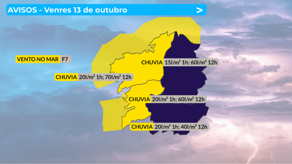 Na xornada deste venres as chuvias volverán a Galicia. A AEMET activou un aviso amarelo pola posibilidade de que se rexistren ata 20l/m2 nunha hora e outro pola posibilidade de que precipiten 60l/m2 en 12.