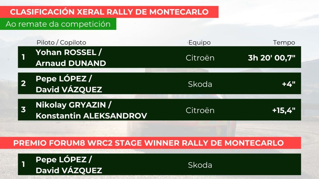 A última xornada do Rally de Montecarlo prometía ser emocionante xa que entre os primeiros (Gryazin e Aleksandrov) e os segundos (López e Vázquez) había 2 décimas de diferencia. Na terceira posición atopábanse Rossel e Dunand a 6,9 segundos do primeiro.