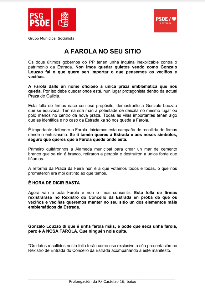 Luis López Bueno, voceiro do PSOE da Estrada, anunciou que o seu partido vai levar a cabo unha recollida de firmas para pedir que a farola da Farola continúe na mesma ubicación. Faráse nos establecementos que desexen participar. Ademais, o vindeiro sábado haberá unha concentración ás 11.30h na Farola.