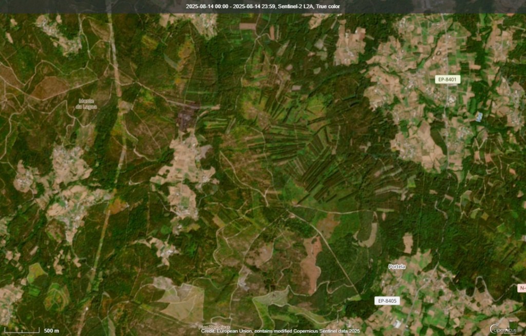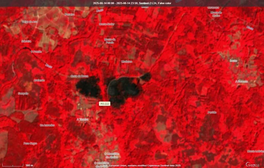 O satélite Copernicus ofrece a imaxe actual do terreo neses puntos. Ademais, co infravermello pódese observar mellor a superficie queimada.