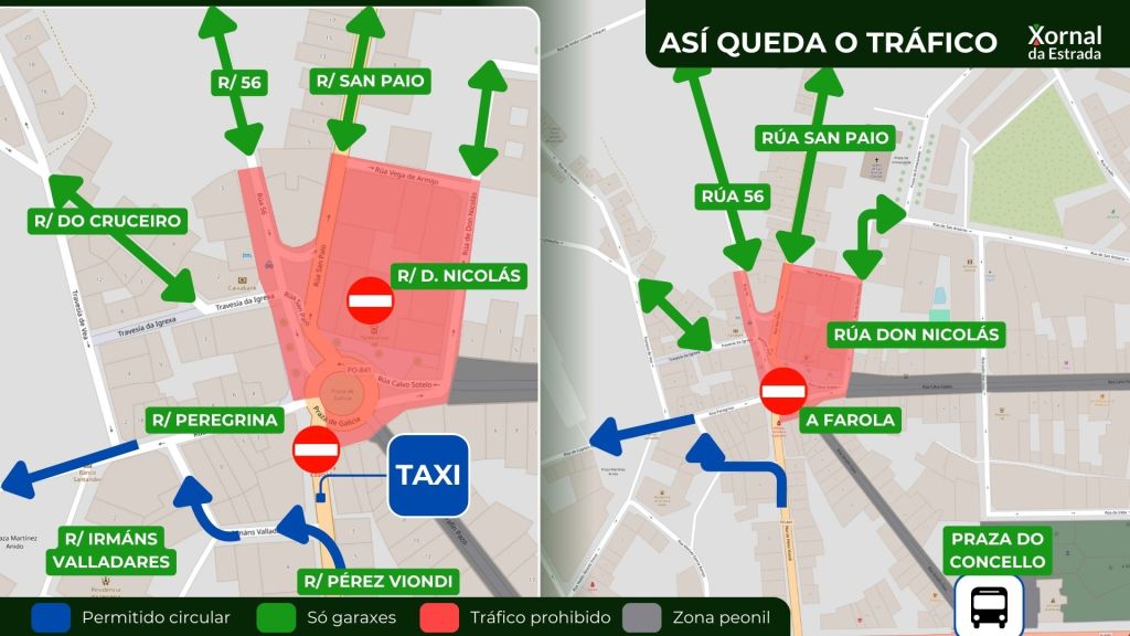 No tocante ao transporte de viaxeiros, a parada de bus manterase a carón do Concello, a onde se trasladou co peche das rúas 56 e San Paio. Os taxis trasladaranse á cabeceira da Rúa Pérez Viondi.