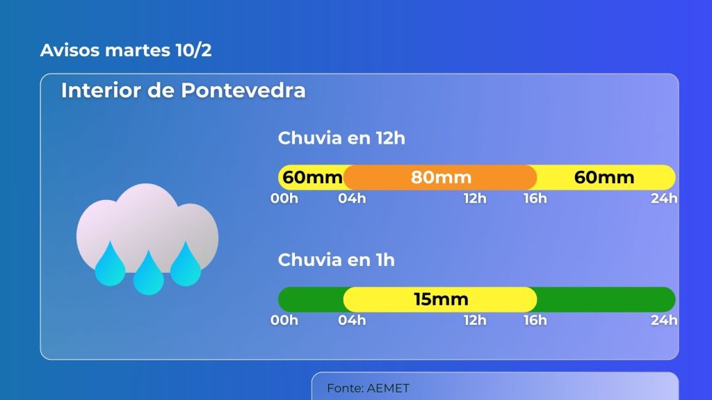 Ademais, entre as 4.00 e as 16.00 horas tamén se activará outro aviso amarelo, neste caso por acumulacións de 15mm nunha hora.