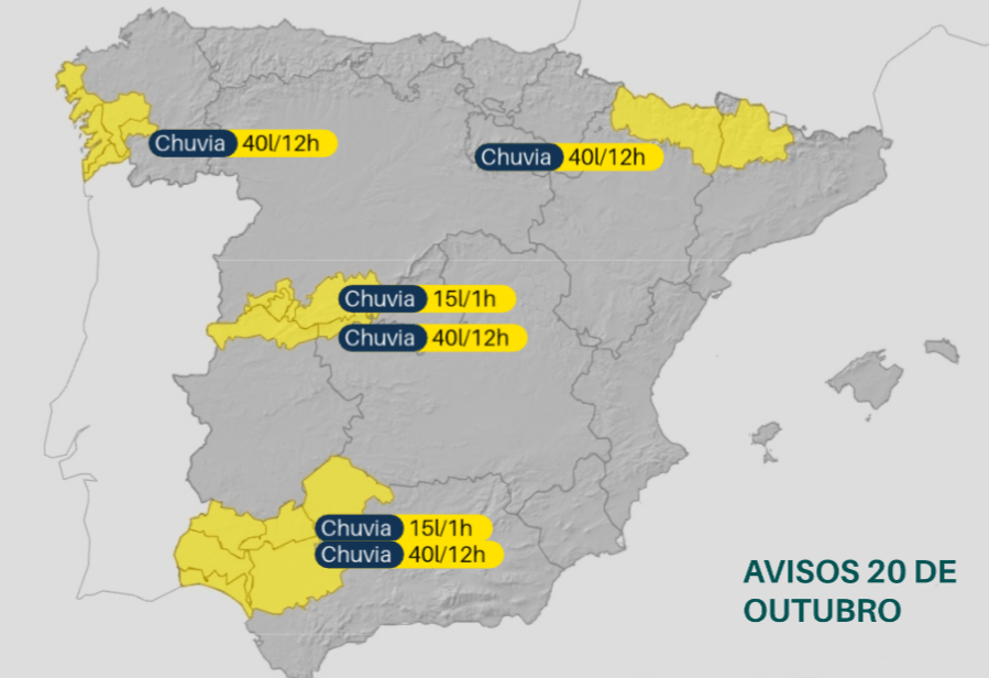 Avisos xoves 20 de outubro. Fonte: AEMET O venres a borrasca alonxaráse cara o norte, pero iráse xerando un novo centro de baixas presións ao oeste da Península, sendo unha posible cicloxénese explosiva. Esta situación favorecerá a chegada dun río atmosférico que impactará de cheo no suroeste peninsular, podendo dar lugar a chuvias localmente fortes.